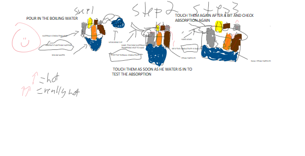 In This Experiment our class taped 6 MATERIALS to a bowl and poured hot water in said bowl, then we touched each one and ranked their hotness and did it with a thernometer!